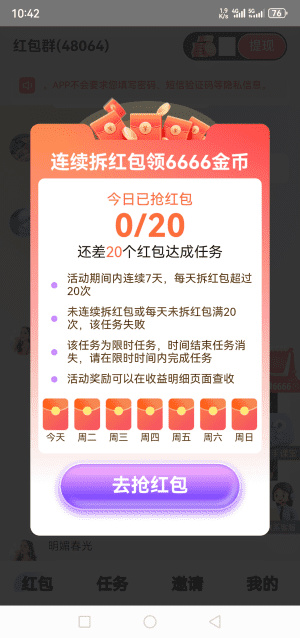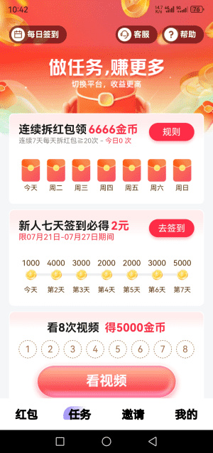 1. 红包群广告任务:点击红包后,系统会自动推送视频广告,必须完整看完视频,才能顺利领取金币奖励。