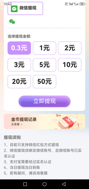 1. 账户异常处理:账户出现异常提示,大概率是存在违规操作,或是手机安装了违规软件;遇到无法自行解决的问题,可直接联系在线客服求助。平台兑换比例为10000金币=1元,邀请好友加入,能一次性获得10000金币,还可长期享受好友收益的20%提成。